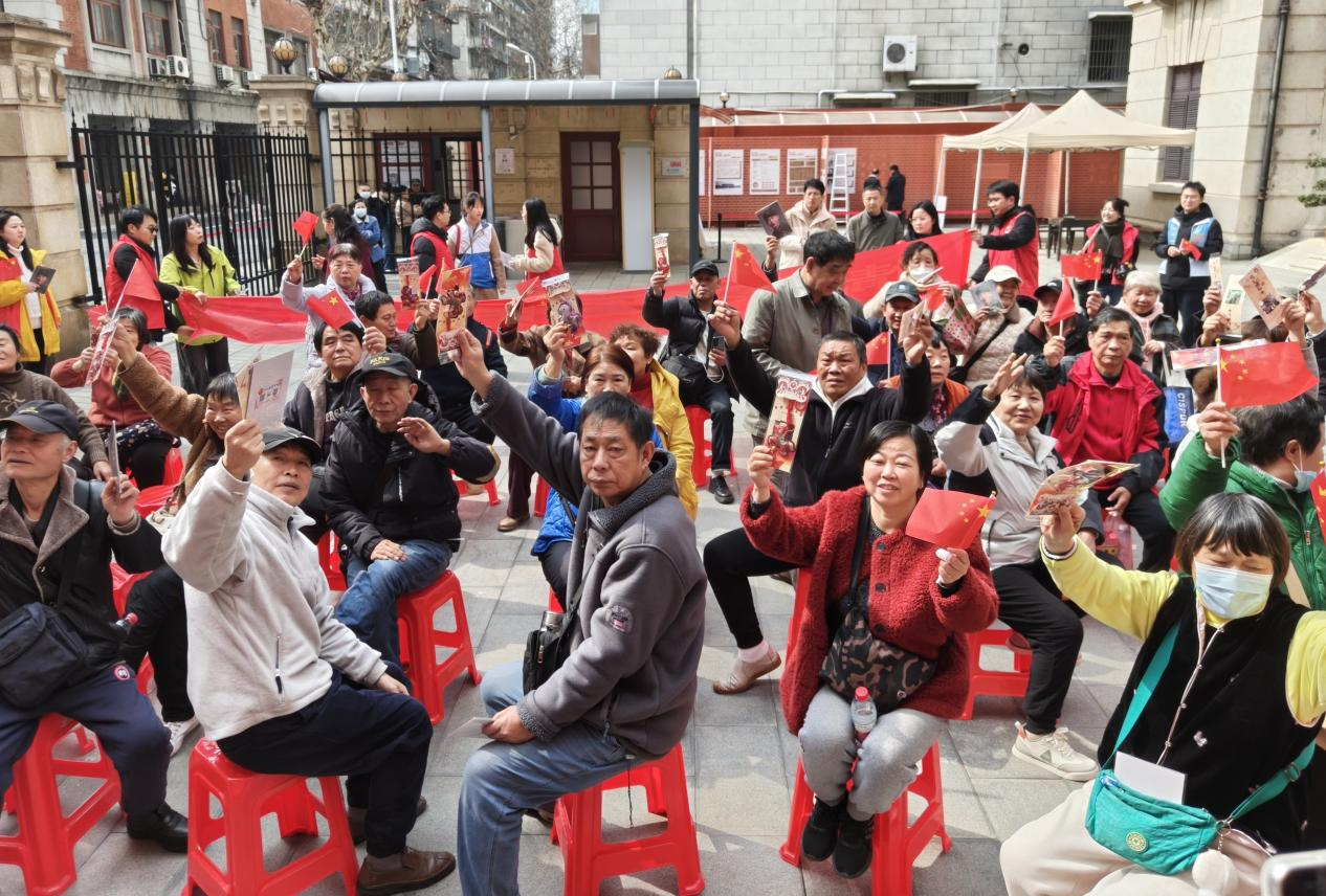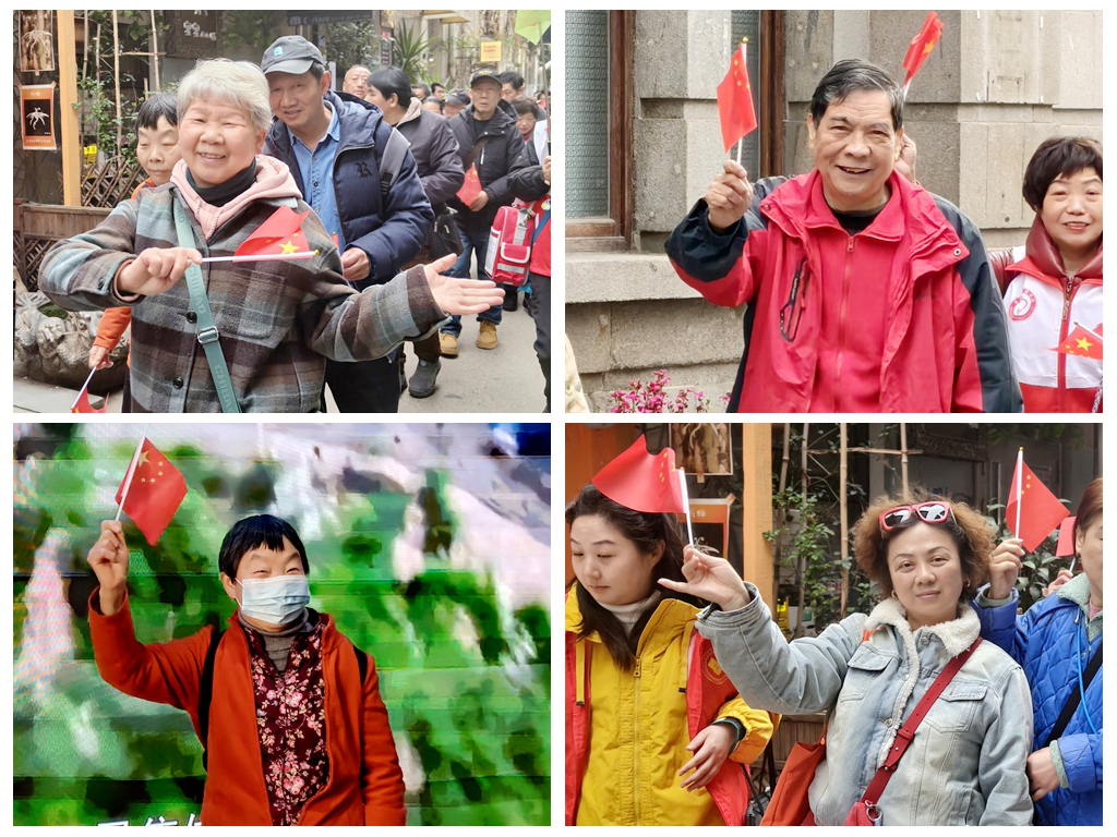 六十位听障老人分五组,在志愿者陪伴下走进城市深处。他们走过同兴里的里分巷道,驻足黎黄陂路的百年洋房,凝望武汉中共中央机关旧址纪念馆的红色楼宇。每到一处地标前,志愿者便微微弯腰凑近老人,一边指着讲解卡片,一边配合手语讲解——手指比划出建筑模样,掌心翻飞间传递历史厚重。同兴里巷口,志愿者用手语比出“长街”“百年”,老人看得入神;八七会议会址纪念馆前,一位老人凝视卡片良久,忽然眼神一亮,缓缓竖起大拇指,轻轻晃动——那是最真挚的“谢谢”与“我懂了”。没有喧哗讲解声,但志愿者的眼神、表情与一次次俯身靠近,搭配灵动手语,建起最温暖的“声音桥梁”。老人们时而点头,时而微笑,有人轻拍志愿者手背表示亲近。青石板安静无声,掌心相扶的温度却清晰可触。